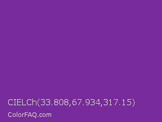 CIELCh 33.808,67.934,317.15 Color is a normal purple color and the nearest color is Purple Heart #69359c. Hex code #752c9a and RGB value is rgb(117,44,154). In RGB color space, this color is composed of 46% red, 17% green, 60% blue, In CMYK color space, this color is composed of 24% cyan, 71% magenta, 0% yellow , 40% black , In HSL color space, this color has a hue angle of 280° , 56% saturation and 39% lightness.