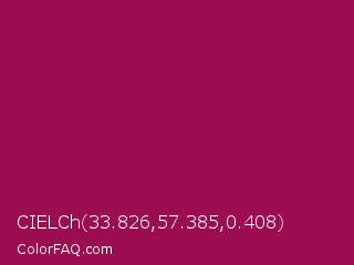CIELCh 33.826,57.385,0.408 Color is a normal rose color and the nearest color is Jazzberry Jam #a50b5e. Hex code #9c0c51 and RGB value is rgb(156,12,81). In RGB color space, this color is composed of 61% red, 5% green, 32% blue, In CMYK color space, this color is composed of 0% cyan, 92% magenta, 48% yellow , 39% black , In HSL color space, this color has a hue angle of 331° , 86% saturation and 33% lightness.