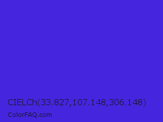 CIELCh 33.827,107.148,306.148 Color is a normal indigo color and the nearest color is Han Purple #5218fa. Hex code #4526de and RGB value is rgb(69,38,222). In RGB color space, this color is composed of 27% red, 15% green, 87% blue, In CMYK color space, this color is composed of 69% cyan, 83% magenta, 0% yellow , 13% black , In HSL color space, this color has a hue angle of 250° , 74% saturation and 51% lightness.