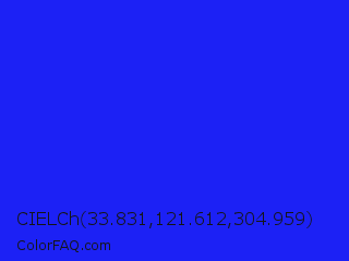 CIELCh 33.831,121.612,304.959 Color is a normal blue color and the nearest color is Bluebonnet #1c1cf0. Hex code #1c21f5 and RGB value is rgb(28,33,245). In RGB color space, this color is composed of 11% red, 13% green, 96% blue, In CMYK color space, this color is composed of 89% cyan, 87% magenta, 0% yellow , 4% black , In HSL color space, this color has a hue angle of 239° , 92% saturation and 54% lightness.