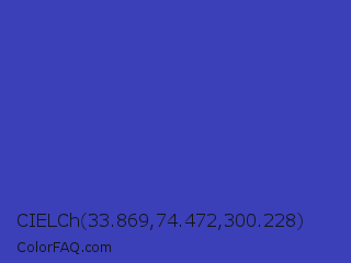 CIELCh 33.869,74.472,300.228 Color is a normal blue color and the nearest color is Governor Bay #2f3cb3. Hex code #3b3fb8 and RGB value is rgb(59,63,184). In RGB color space, this color is composed of 23% red, 25% green, 72% blue, In CMYK color space, this color is composed of 68% cyan, 66% magenta, 0% yellow , 28% black , In HSL color space, this color has a hue angle of 238° , 51% saturation and 48% lightness.