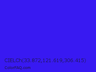CIELCh 33.872,121.619,306.415 Color is a normal indigo color and the nearest color is Han Purple #5218fa. Hex code #3819f2 and RGB value is rgb(56,25,242). In RGB color space, this color is composed of 22% red, 10% green, 95% blue, In CMYK color space, this color is composed of 77% cyan, 90% magenta, 0% yellow , 5% black , In HSL color space, this color has a hue angle of 249° , 89% saturation and 52% lightness.
