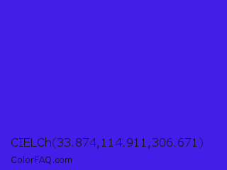 CIELCh 33.874,114.911,306.671 Color is a normal indigo color and the nearest color is Han Purple #5218fa. Hex code #431ee8 and RGB value is rgb(67,30,232). In RGB color space, this color is composed of 26% red, 12% green, 91% blue, In CMYK color space, this color is composed of 71% cyan, 87% magenta, 0% yellow , 9% black , In HSL color space, this color has a hue angle of 251° , 81% saturation and 51% lightness.