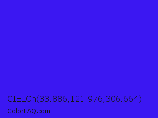 CIELCh 33.886,121.976,306.664 Color is a normal indigo color and the nearest color is Han Purple #5218fa. Hex code #3b17f2 and RGB value is rgb(59,23,242). In RGB color space, this color is composed of 23% red, 9% green, 95% blue, In CMYK color space, this color is composed of 76% cyan, 90% magenta, 0% yellow , 5% black , In HSL color space, this color has a hue angle of 250° , 89% saturation and 52% lightness.