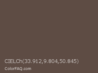CIELCh 33.912,9.804,50.845 Color is a normal orange color and the nearest color is Kabul #5e483e. Hex code #5e4c44 and RGB value is rgb(94,76,68). In RGB color space, this color is composed of 37% red, 30% green, 27% blue, In CMYK color space, this color is composed of 0% cyan, 19% magenta, 28% yellow , 63% black , In HSL color space, this color has a hue angle of 18° , 16% saturation and 32% lightness.