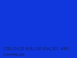 CIELCh 33.918,100.654,301.449 Color is a normal blue color and the nearest color is Palatinate Blue #273be2. Hex code #1036dd and RGB value is rgb(16,54,221). In RGB color space, this color is composed of 6% red, 21% green, 87% blue, In CMYK color space, this color is composed of 93% cyan, 76% magenta, 0% yellow , 13% black , In HSL color space, this color has a hue angle of 229° , 86% saturation and 46% lightness.
