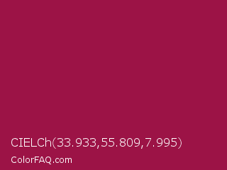 CIELCh 33.933,55.809,7.995 Color is a normal rose color and the nearest color is Big Dip O Ruby #9c2542. Hex code #9c1346 and RGB value is rgb(156,19,70). In RGB color space, this color is composed of 61% red, 7% green, 27% blue, In CMYK color space, this color is composed of 0% cyan, 88% magenta, 55% yellow , 39% black , In HSL color space, this color has a hue angle of 338° , 78% saturation and 34% lightness.