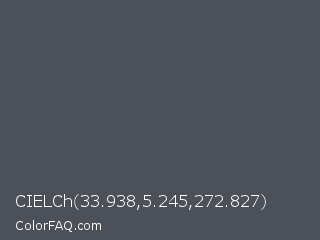 CIELCh 33.938,5.245,272.827 Color is a normal blue color and the nearest color is Abbey #4c4f56. Hex code #4c5058 and RGB value is rgb(76,80,88). In RGB color space, this color is composed of 30% red, 31% green, 35% blue, In CMYK color space, this color is composed of 14% cyan, 9% magenta, 0% yellow , 65% black , In HSL color space, this color has a hue angle of 220° , 7% saturation and 32% lightness.