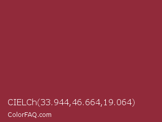 CIELCh 33.944,46.664,19.064 Color is a normal red color and the nearest color is Japanese Carmine #9d2933. Hex code #912a3a and RGB value is rgb(145,42,58). In RGB color space, this color is composed of 57% red, 16% green, 23% blue, In CMYK color space, this color is composed of 0% cyan, 71% magenta, 60% yellow , 43% black , In HSL color space, this color has a hue angle of 351° , 55% saturation and 37% lightness.
