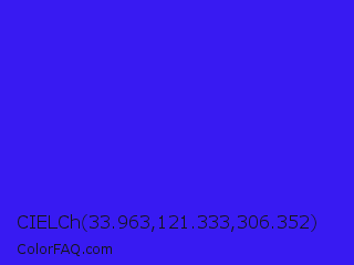 CIELCh 33.963,121.333,306.352 Color is a normal indigo color and the nearest color is Han Purple #5218fa. Hex code #381af2 and RGB value is rgb(56,26,242). In RGB color space, this color is composed of 22% red, 10% green, 95% blue, In CMYK color space, this color is composed of 77% cyan, 89% magenta, 0% yellow , 5% black , In HSL color space, this color has a hue angle of 248° , 89% saturation and 53% lightness.
