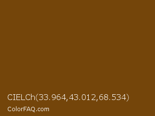 CIELCh 33.964,43.012,68.534 Color is a dark orange color and the nearest color is Cafe Royale #6f440c. Hex code #74450a and RGB value is rgb(116,69,10). In RGB color space, this color is composed of 45% red, 27% green, 4% blue, In CMYK color space, this color is composed of 0% cyan, 41% magenta, 91% yellow , 55% black , In HSL color space, this color has a hue angle of 33° , 84% saturation and 25% lightness.