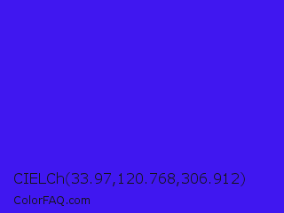 CIELCh 33.97,120.768,306.912 Color is a normal indigo color and the nearest color is Han Purple #5218fa. Hex code #4017f0 and RGB value is rgb(64,23,240). In RGB color space, this color is composed of 25% red, 9% green, 94% blue, In CMYK color space, this color is composed of 73% cyan, 90% magenta, 0% yellow , 6% black , In HSL color space, this color has a hue angle of 251° , 88% saturation and 52% lightness.