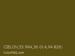 CIELCh 33.994,36.014,94.826 Color is a very dark yellow color and the nearest color is Horses Neck #604913. Hex code #5b5012 and RGB value is rgb(91,80,18). In RGB color space, this color is composed of 36% red, 31% green, 7% blue, In CMYK color space, this color is composed of 0% cyan, 12% magenta, 80% yellow , 64% black , In HSL color space, this color has a hue angle of 51° , 67% saturation and 21% lightness.