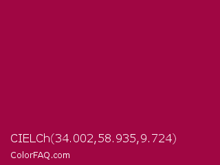 CIELCh 34.002,58.935,9.724 Color is a normal rose color and the nearest color is Pink Raspberry #980036. Hex code #a00643 and RGB value is rgb(160,6,67). In RGB color space, this color is composed of 63% red, 2% green, 26% blue, In CMYK color space, this color is composed of 0% cyan, 96% magenta, 58% yellow , 37% black , In HSL color space, this color has a hue angle of 336° , 93% saturation and 33% lightness.