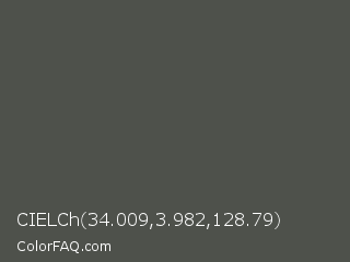 CIELCh 34.009,3.982,128.79 Color is a normal green color and the nearest color is Fuscous Gray #54534d. Hex code #4e514b and RGB value is rgb(78,81,75). In RGB color space, this color is composed of 31% red, 32% green, 29% blue, In CMYK color space, this color is composed of 4% cyan, 0% magenta, 7% yellow , 68% black , In HSL color space, this color has a hue angle of 90° , 4% saturation and 31% lightness.