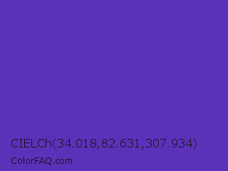 CIELCh 34.018,82.631,307.934 Color is a normal indigo color and the nearest color is Purple Heart Crayola #652dc1. Hex code #5c31ba and RGB value is rgb(92,49,186). In RGB color space, this color is composed of 36% red, 19% green, 73% blue, In CMYK color space, this color is composed of 51% cyan, 74% magenta, 0% yellow , 27% black , In HSL color space, this color has a hue angle of 259° , 58% saturation and 46% lightness.