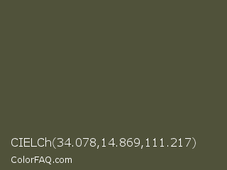 CIELCh 34.078,14.869,111.217 Color is a dark yellow color and the nearest color is Rifle Green #444c38. Hex code #50523a and RGB value is rgb(80,82,58). In RGB color space, this color is composed of 31% red, 32% green, 23% blue, In CMYK color space, this color is composed of 2% cyan, 0% magenta, 29% yellow , 68% black , In HSL color space, this color has a hue angle of 65° , 17% saturation and 27% lightness.