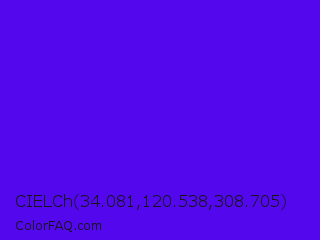 CIELCh 34.081,120.538,308.705 Color is a normal indigo color and the nearest color is Han Purple #5218fa. Hex code #5307ec and RGB value is rgb(83,7,236). In RGB color space, this color is composed of 33% red, 3% green, 93% blue, In CMYK color space, this color is composed of 65% cyan, 97% magenta, 0% yellow , 7% black , In HSL color space, this color has a hue angle of 260° , 94% saturation and 48% lightness.