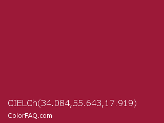 CIELCh 34.084,55.643,17.919 Color is a normal red color and the nearest color is Vivid Burgundy #9f1d35. Hex code #9c1938 and RGB value is rgb(156,25,56). In RGB color space, this color is composed of 61% red, 10% green, 22% blue, In CMYK color space, this color is composed of 0% cyan, 84% magenta, 64% yellow , 39% black , In HSL color space, this color has a hue angle of 346° , 72% saturation and 35% lightness.