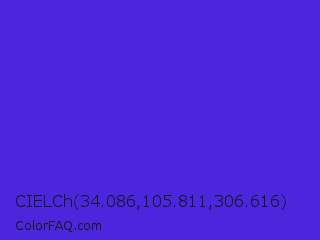 CIELCh 34.086,105.811,306.616 Color is a normal indigo color and the nearest color is Han Purple #5218fa. Hex code #4b26dc and RGB value is rgb(75,38,220). In RGB color space, this color is composed of 29% red, 15% green, 86% blue, In CMYK color space, this color is composed of 66% cyan, 83% magenta, 0% yellow , 14% black , In HSL color space, this color has a hue angle of 252° , 72% saturation and 51% lightness.