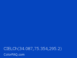CIELCh 34.087,75.354,295.2 Color is a normal blue color and the nearest color is Absolute Zero #0048ba. Hex code #0545bf and RGB value is rgb(5,69,191). In RGB color space, this color is composed of 2% red, 27% green, 75% blue, In CMYK color space, this color is composed of 97% cyan, 64% magenta, 0% yellow , 25% black , In HSL color space, this color has a hue angle of 219° , 95% saturation and 38% lightness.