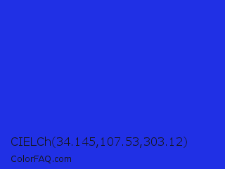 CIELCh 34.145,107.53,303.12 Color is a normal blue color and the nearest color is Palatinate Blue #273be2. Hex code #2030e5 and RGB value is rgb(32,48,229). In RGB color space, this color is composed of 13% red, 19% green, 90% blue, In CMYK color space, this color is composed of 86% cyan, 79% magenta, 0% yellow , 10% black , In HSL color space, this color has a hue angle of 235° , 79% saturation and 51% lightness.