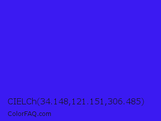 CIELCh 34.148,121.151,306.485 Color is a normal indigo color and the nearest color is Han Purple #5218fa. Hex code #3b1af2 and RGB value is rgb(59,26,242). In RGB color space, this color is composed of 23% red, 10% green, 95% blue, In CMYK color space, this color is composed of 76% cyan, 89% magenta, 0% yellow , 5% black , In HSL color space, this color has a hue angle of 249° , 89% saturation and 53% lightness.