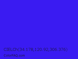 CIELCh 34.178,120.92,306.376 Color is a normal indigo color and the nearest color is Han Purple #5218fa. Hex code #3a1bf2 and RGB value is rgb(58,27,242). In RGB color space, this color is composed of 23% red, 11% green, 95% blue, In CMYK color space, this color is composed of 76% cyan, 89% magenta, 0% yellow , 5% black , In HSL color space, this color has a hue angle of 249° , 89% saturation and 53% lightness.