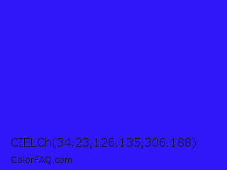 CIELCh 34.23,126.135,306.188 Color is a normal indigo color and the nearest color is Bluebonnet #1c1cf0. Hex code #2f17fa and RGB value is rgb(47,23,250). In RGB color space, this color is composed of 18% red, 9% green, 98% blue, In CMYK color space, this color is composed of 81% cyan, 91% magenta, 0% yellow , 2% black , In HSL color space, this color has a hue angle of 246° , 96% saturation and 54% lightness.