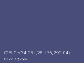 CIELCh 34.251,28.176,292.04 Color is a normal blue color and the nearest color is East Bay #414c7d. Hex code #494d7a and RGB value is rgb(73,77,122). In RGB color space, this color is composed of 29% red, 30% green, 48% blue, In CMYK color space, this color is composed of 40% cyan, 37% magenta, 0% yellow , 52% black , In HSL color space, this color has a hue angle of 235° , 25% saturation and 38% lightness.