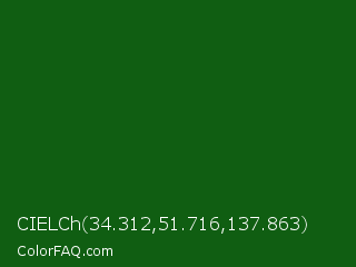 CIELCh 34.312,51.716,137.863 Color is a very dark green color and the nearest color is San Felix #0b6207. Hex code #105e12 and RGB value is rgb(16,94,18). In RGB color space, this color is composed of 6% red, 37% green, 7% blue, In CMYK color space, this color is composed of 83% cyan, 0% magenta, 81% yellow , 63% black , In HSL color space, this color has a hue angle of 122° , 71% saturation and 22% lightness.