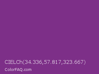 CIELCh 34.336,57.817,323.667 Color is a normal magenta color and the nearest color is Vivid Violet #803790. Hex code #7d2f88 and RGB value is rgb(125,47,136). In RGB color space, this color is composed of 49% red, 18% green, 53% blue, In CMYK color space, this color is composed of 8% cyan, 65% magenta, 0% yellow , 47% black , In HSL color space, this color has a hue angle of 293° , 49% saturation and 36% lightness.