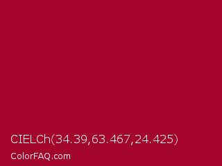 CIELCh 34.39,63.467,24.425 Color is a normal red color and the nearest color is Alabama Crimson #af002a. Hex code #a4062b and RGB value is rgb(164,6,43). In RGB color space, this color is composed of 64% red, 2% green, 17% blue, In CMYK color space, this color is composed of 0% cyan, 96% magenta, 74% yellow , 36% black , In HSL color space, this color has a hue angle of 346° , 93% saturation and 33% lightness.