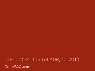 CIELCh 34.406,63.408,40.701 Color is a normal red color and the nearest color is Tabasco #a02712. Hex code #9b230f and RGB value is rgb(155,35,15). In RGB color space, this color is composed of 61% red, 14% green, 6% blue, In CMYK color space, this color is composed of 0% cyan, 77% magenta, 90% yellow , 39% black , In HSL color space, this color has a hue angle of 9° , 82% saturation and 33% lightness.