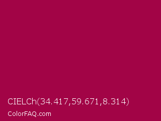 CIELCh 34.417,59.671,8.314 Color is a normal rose color and the nearest color is Pink Raspberry #980036. Hex code #a20446 and RGB value is rgb(162,4,70). In RGB color space, this color is composed of 64% red, 2% green, 27% blue, In CMYK color space, this color is composed of 0% cyan, 98% magenta, 57% yellow , 36% black , In HSL color space, this color has a hue angle of 335° , 95% saturation and 33% lightness.