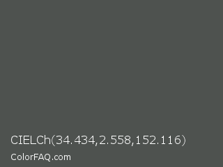 CIELCh 34.434,2.558,152.116 Color is a normal green color and the nearest color is Fuscous Gray #54534d. Hex code #4e524f and RGB value is rgb(78,82,79). In RGB color space, this color is composed of 31% red, 32% green, 31% blue, In CMYK color space, this color is composed of 5% cyan, 0% magenta, 4% yellow , 68% black , In HSL color space, this color has a hue angle of 135° , 3% saturation and 31% lightness.