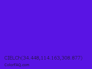 CIELCh 34.448,114.163,308.877 Color is a normal indigo color and the nearest color is Han Purple #5218fa. Hex code #5914e4 and RGB value is rgb(89,20,228). In RGB color space, this color is composed of 35% red, 8% green, 89% blue, In CMYK color space, this color is composed of 61% cyan, 91% magenta, 0% yellow , 11% black , In HSL color space, this color has a hue angle of 260° , 84% saturation and 49% lightness.