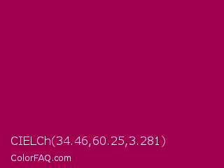CIELCh 34.46,60.25,3.281 Color is a normal rose color and the nearest color is Jazzberry Jam #a50b5e. Hex code #a2004e and RGB value is rgb(162,0,78). In RGB color space, this color is composed of 64% red, 0% green, 31% blue, In CMYK color space, this color is composed of 0% cyan, 100% magenta, 52% yellow , 36% black , In HSL color space, this color has a hue angle of 331° , 100% saturation and 32% lightness.