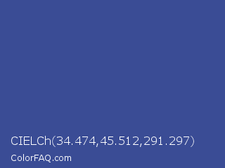 CIELCh 34.474,45.512,291.297 Color is a normal blue color and the nearest color is Chambray #354e8c. Hex code #3a4c95 and RGB value is rgb(58,76,149). In RGB color space, this color is composed of 23% red, 30% green, 58% blue, In CMYK color space, this color is composed of 61% cyan, 49% magenta, 0% yellow , 42% black , In HSL color space, this color has a hue angle of 228° , 44% saturation and 41% lightness.