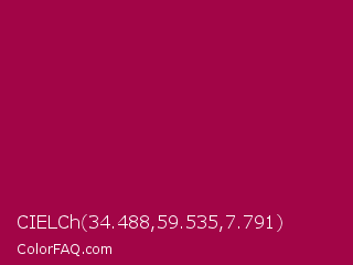 CIELCh 34.488,59.535,7.791 Color is a normal rose color and the nearest color is Pink Raspberry #980036. Hex code #a20547 and RGB value is rgb(162,5,71). In RGB color space, this color is composed of 64% red, 2% green, 28% blue, In CMYK color space, this color is composed of 0% cyan, 97% magenta, 56% yellow , 36% black , In HSL color space, this color has a hue angle of 335° , 94% saturation and 33% lightness.