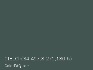CIELCh 34.497,8.271,180.6 Color is a dark cyan color and the nearest color is Mineral Green #3f5d53. Hex code #425551 and RGB value is rgb(66,85,81). In RGB color space, this color is composed of 26% red, 33% green, 32% blue, In CMYK color space, this color is composed of 22% cyan, 0% magenta, 5% yellow , 67% black , In HSL color space, this color has a hue angle of 167° , 13% saturation and 30% lightness.