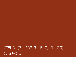 CIELCh 34.565,54.847,43.125 Color is a normal red color and the nearest color is Kobe #882d17. Hex code #923016 and RGB value is rgb(146,48,22). In RGB color space, this color is composed of 57% red, 19% green, 9% blue, In CMYK color space, this color is composed of 0% cyan, 67% magenta, 85% yellow , 43% black , In HSL color space, this color has a hue angle of 13° , 74% saturation and 33% lightness.