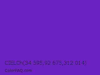 CIELCh 34.595,92.675,312.014 Color is a normal violet color and the nearest color is Purple Heart Crayola #652dc1. Hex code #6e21c2 and RGB value is rgb(110,33,194). In RGB color space, this color is composed of 43% red, 13% green, 76% blue, In CMYK color space, this color is composed of 43% cyan, 83% magenta, 0% yellow , 24% black , In HSL color space, this color has a hue angle of 269° , 71% saturation and 45% lightness.