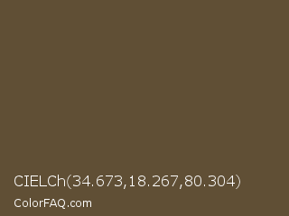 CIELCh 34.673,18.267,80.304 Color is a dark orange color and the nearest color is Kabul #5e483e. Hex code #604f35 and RGB value is rgb(96,79,53). In RGB color space, this color is composed of 38% red, 31% green, 21% blue, In CMYK color space, this color is composed of 0% cyan, 18% magenta, 45% yellow , 62% black , In HSL color space, this color has a hue angle of 36° , 29% saturation and 29% lightness.