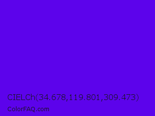 CIELCh 34.678,119.801,309.473 Color is a normal violet color and the nearest color is Han Purple #5218fa. Hex code #5c03eb and RGB value is rgb(92,3,235). In RGB color space, this color is composed of 36% red, 1% green, 92% blue, In CMYK color space, this color is composed of 61% cyan, 99% magenta, 0% yellow , 8% black , In HSL color space, this color has a hue angle of 263° , 97% saturation and 47% lightness.