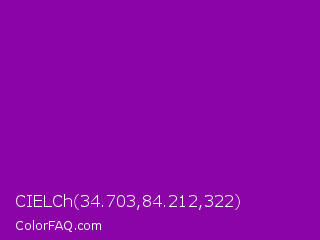 CIELCh 34.703,84.212,322 Color is a normal purple color and the nearest color is Violet RYB #8601af. Hex code #8b05a6 and RGB value is rgb(139,5,166). In RGB color space, this color is composed of 55% red, 2% green, 65% blue, In CMYK color space, this color is composed of 16% cyan, 97% magenta, 0% yellow , 35% black , In HSL color space, this color has a hue angle of 290° , 94% saturation and 34% lightness.