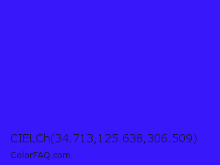 CIELCh 34.713,125.638,306.509 Color is a normal indigo color and the nearest color is Electric Ultramarine #3f00ff. Hex code #3817fa and RGB value is rgb(56,23,250). In RGB color space, this color is composed of 22% red, 9% green, 98% blue, In CMYK color space, this color is composed of 78% cyan, 91% magenta, 0% yellow , 2% black , In HSL color space, this color has a hue angle of 249° , 96% saturation and 54% lightness.