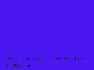 CIELCh 34.721,120.038,307.455 Color is a normal indigo color and the nearest color is Han Purple #5218fa. Hex code #4a17f0 and RGB value is rgb(74,23,240). In RGB color space, this color is composed of 29% red, 9% green, 94% blue, In CMYK color space, this color is composed of 69% cyan, 90% magenta, 0% yellow , 6% black , In HSL color space, this color has a hue angle of 254° , 88% saturation and 52% lightness.