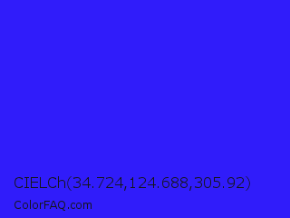 CIELCh 34.724,124.688,305.92 Color is a normal indigo color and the nearest color is Bluebonnet #1c1cf0. Hex code #301cfa and RGB value is rgb(48,28,250). In RGB color space, this color is composed of 19% red, 11% green, 98% blue, In CMYK color space, this color is composed of 81% cyan, 89% magenta, 0% yellow , 2% black , In HSL color space, this color has a hue angle of 245° , 96% saturation and 55% lightness.