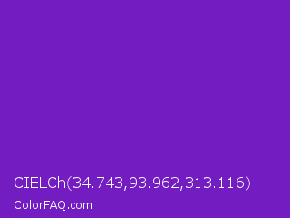 CIELCh 34.743,93.962,313.116 Color is a normal purple color and the nearest color is Purple Heart Crayola #652dc1. Hex code #731cc2 and RGB value is rgb(115,28,194). In RGB color space, this color is composed of 45% red, 11% green, 76% blue, In CMYK color space, this color is composed of 41% cyan, 86% magenta, 0% yellow , 24% black , In HSL color space, this color has a hue angle of 271° , 75% saturation and 44% lightness.